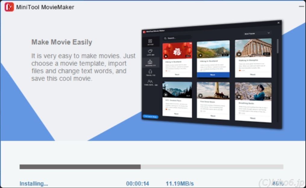 するとMinitool MovieMakerのインストール進行画面がでてきました。うちは光回線で100%まで1分弱でした。