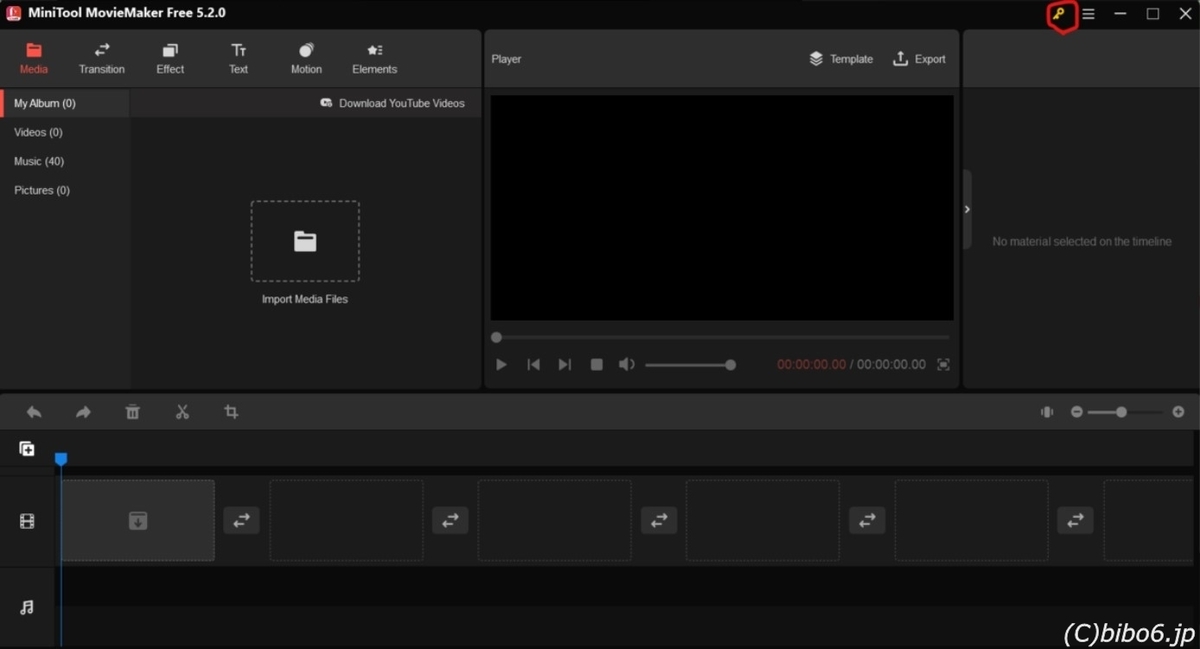 Mini Tool MovieMaker free が起動されたので、画面右上の「鍵マーク(画像赤丸)」をクリックして、プロ・アルティメット版のライセンス番号を入力しました。