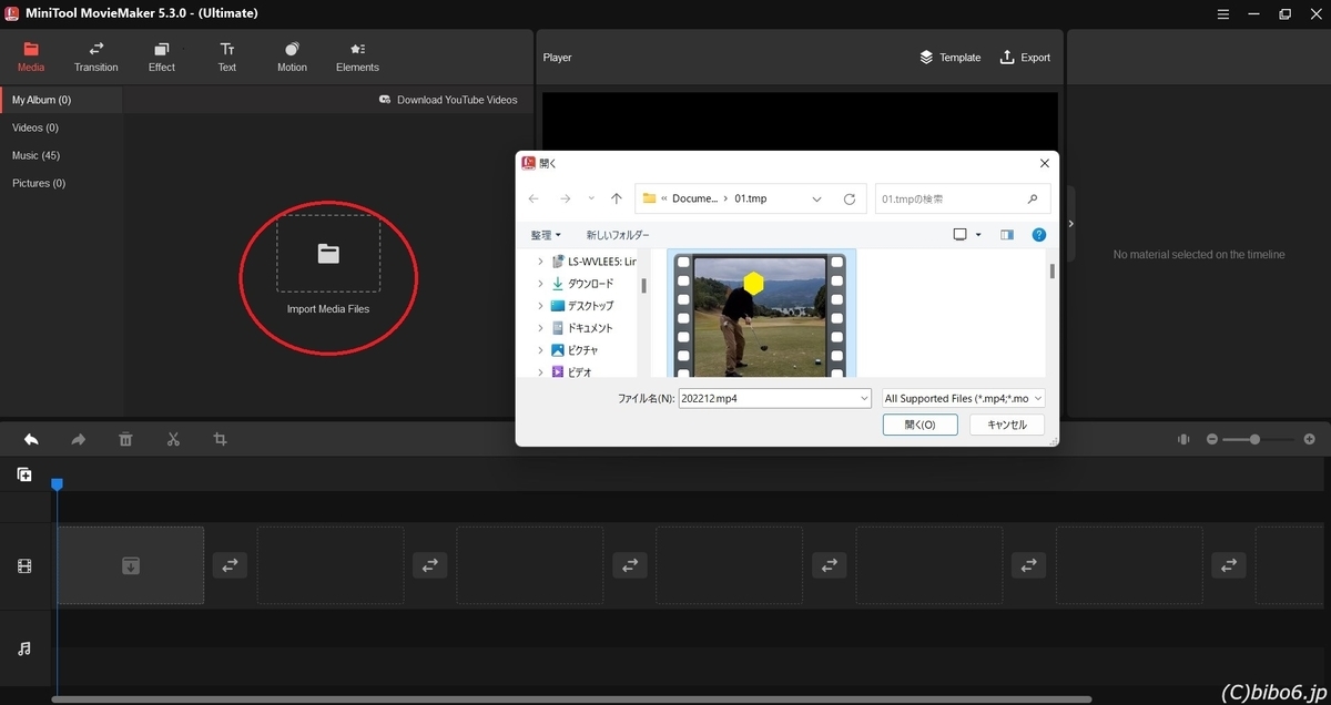「Mini Tool MovieMaker プロ・アルティメット版 5.3.0」はドラック&ドロップできないので、「Import Media Files(画像赤丸)」をクリックし「開く」で映像ファイルを指定します。